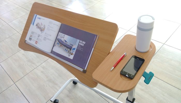 This Peak height adjustable overbed table provides a sturdy and convenient table for a patient or resident in bed or seated in a chair. It has a powder coated steel frame, a "C" shaped base and fingertip pressure adjustable table height. The table itself is laminated wood with PVC edges, and is supported by twin wheel casters (two of which are locking).
